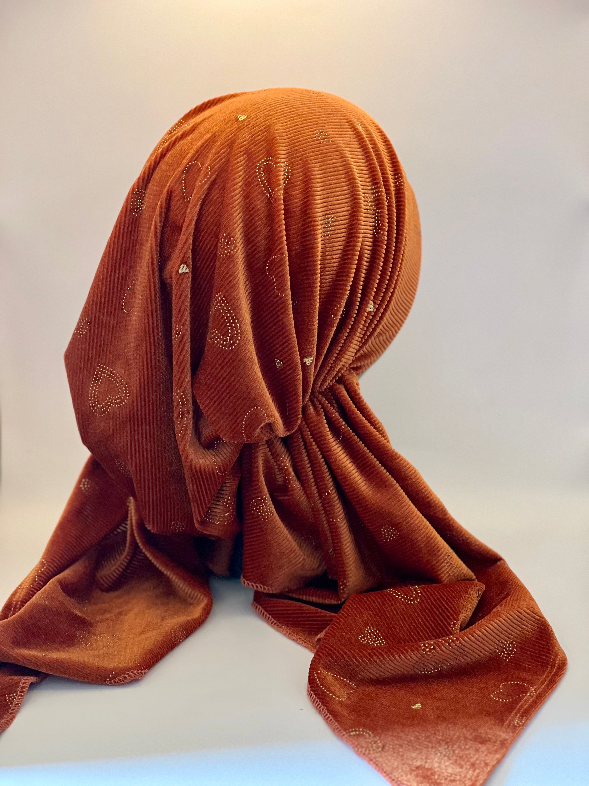 Delicate shimmer meets cozy warmth in the Levona tichel — a heart-dotted velvet wrap designed for softness, elegance, and intention. Its plush corduroy texture feels luxurious to the touch while gold-accented hearts add a whisper of romance.