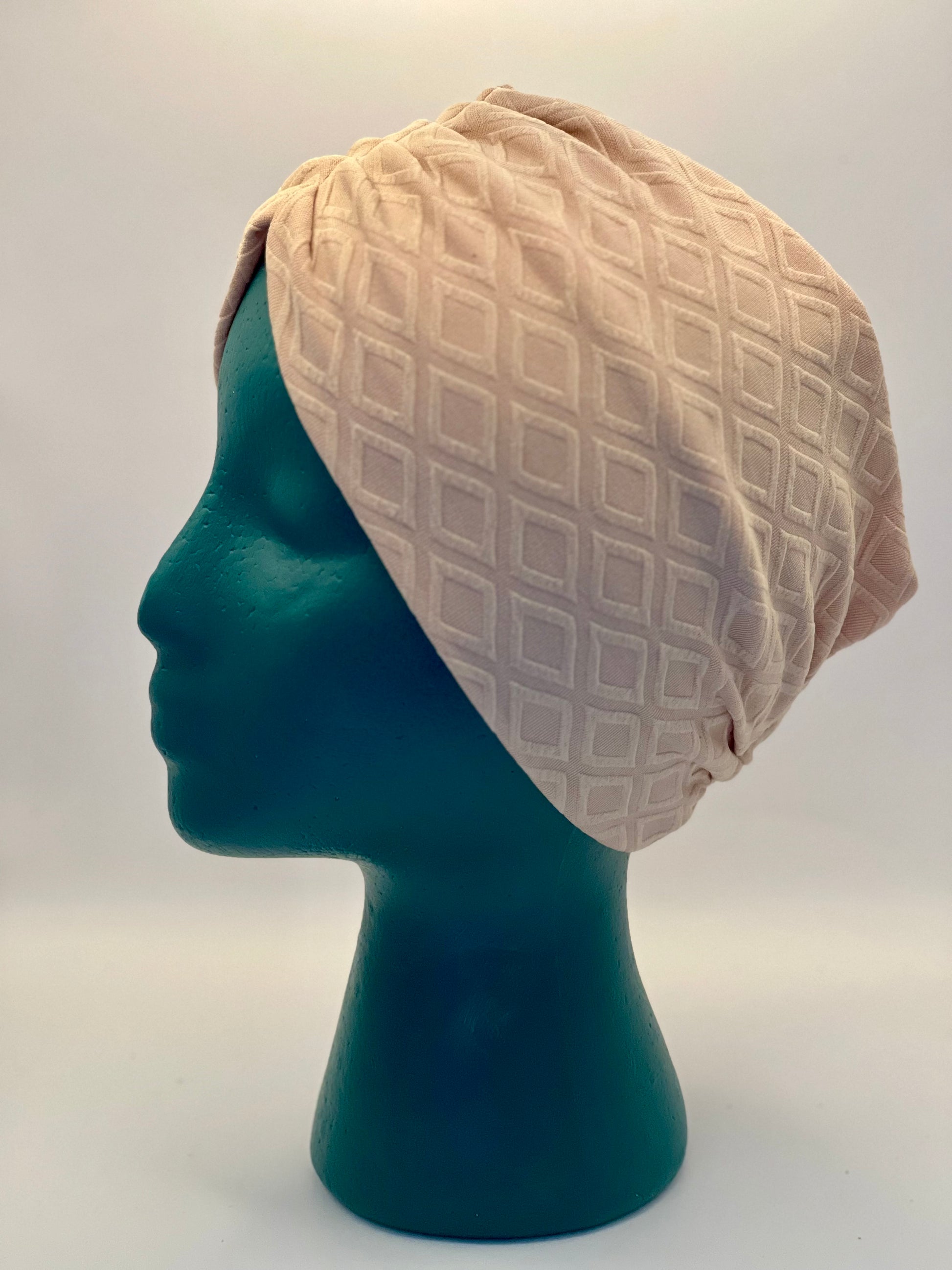 Elevate your everyday with Talya — a soft, pre-sewn tichel that combines comfort with understated elegance. The geometric diamond texture adds subtle dimension, while the lightweight stretch cotton hugs your head gently and securely throughout the day.