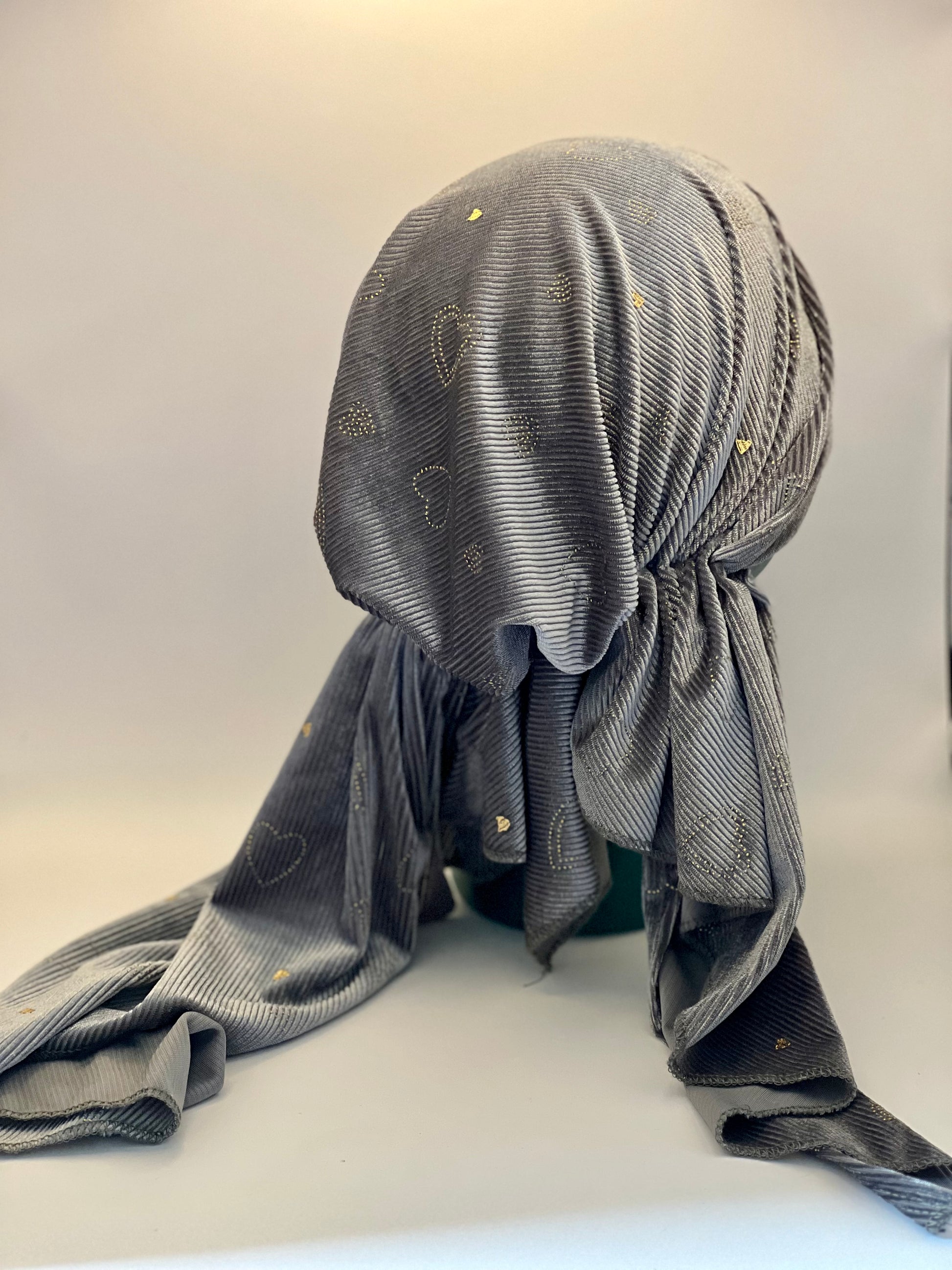 Delicate shimmer meets cozy warmth in the Levona tichel — a heart-dotted velvet wrap designed for softness, elegance, and intention. Its plush corduroy texture feels luxurious to the touch while gold-accented hearts add a whisper of romance.